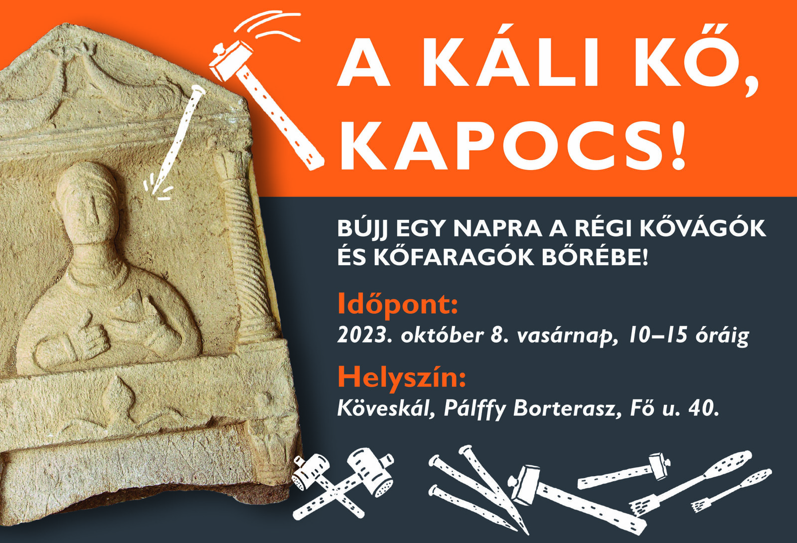 Programunkkal ezt a „pillanatot” szeretnénk megidézni és mai kőfaragók segítségével kipróbálhatóvá, élményszerűvé tenni látogatóink számára, hogy együtt érezzünk rá a kövek megmunkálásának örömére. A rendezvényt a geológiai, régészeti és néprajzi korokba repítő színes beszámoló, séta és tárgysimogató kíséri.