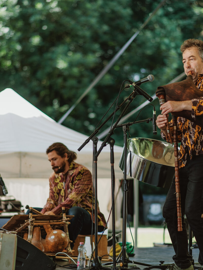 Hallottál már olyan harsonáról, ami konyhai mosogatóból készült és steel drummal (léleklábassal) kísérik? Mit szólnál egy bolgár duda és ghánai xilofon duóhoz? Danny Bain és Ágoston Béla először a Művészetek Völgye fesztiválon való közös koncertjük kapcsán találkozott, 2019-ben. Így az együttműködésük már a kezdetektől váratlan keveréke lett a különböző kultúráknak, stílusoknak és zenei tapasztalatoknak, és ennek a végtelen lehetőségeit próbálják azóta is színpadra vinni. Már a népi, klasszikus és házi készítésű hangszerek egyedi kombinációja is elég lenne ahhoz, hogy rabul ejtse a közönséget, de Danny előadói fortélyaival és Béla abszurd humorérzékével, az előadásaik valami olyasmivé alakultak, ami elmossa a színház és koncert közötti határokat.