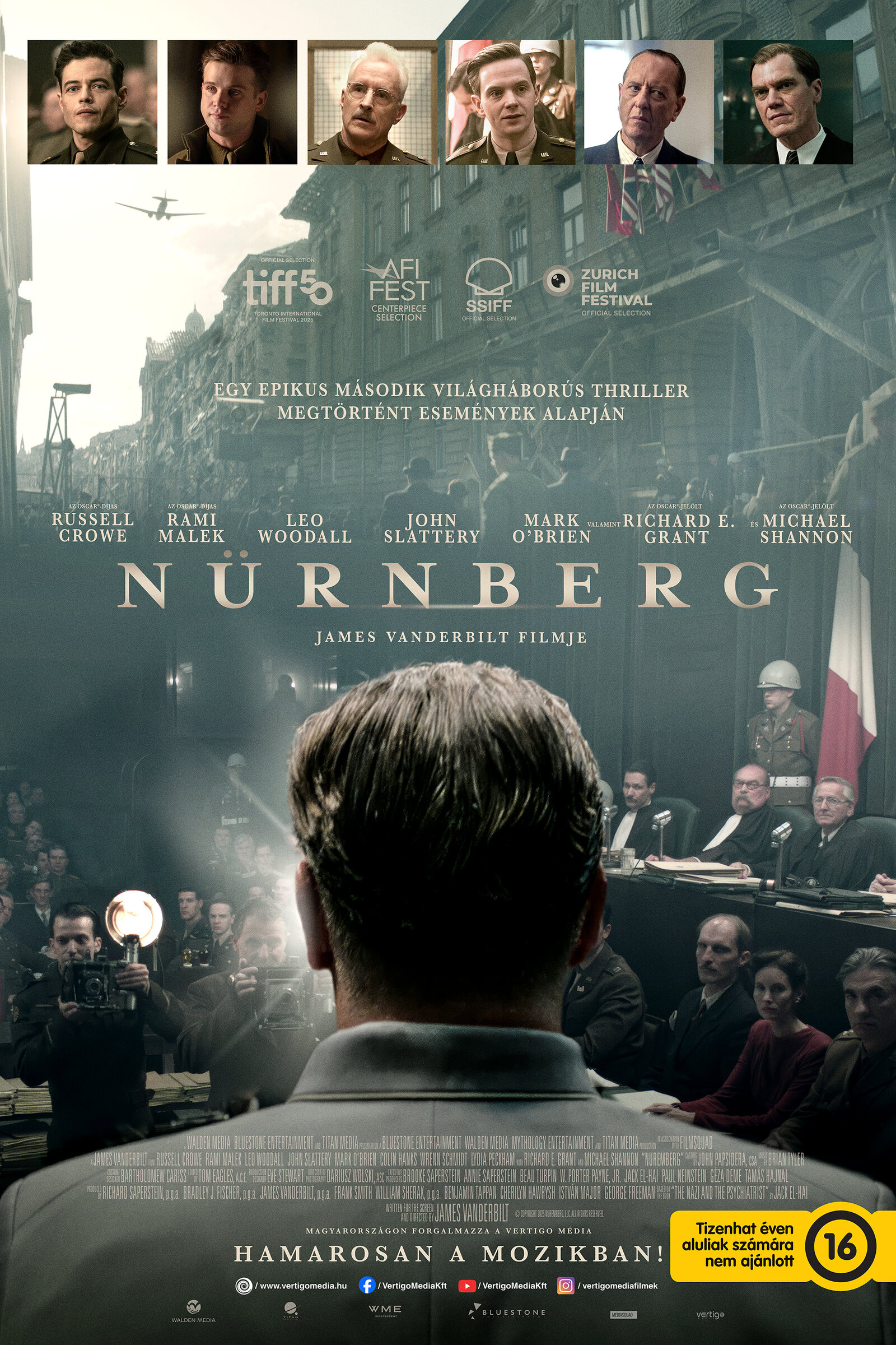 A Nürnberg világpremierje a világ egyik legrangosabb nemzetközi filmfesztiválján, a Torontói Nemzetközi Filmfesztiválon volt. Az alkotás emellett versenyben volt az ‚A‘ kategóriás San Sebastian-i Nemzetközi Fimfesztiválon, ahol díjat is nyert. James Vanderbilt az egyik legsikeresebb hollywoodi producer és forgatókönyvíró, aki olyan filmeket jegyzett korábban, mint több Sikoly-film, A csodálatos Pókember 1-2, a Zodiákus, vagy A függetlenség napja: Feltámadás. A nagyszabású hollywoodi alkotás kivételes sztárparádét vonultat fel: Göringet az Oscar-díjas Russell Crowe (Gladiátor, Egy csodálatos elme, Szigorúan bizalmas, Kraven, a vadász), a pszichiátert az Oscar-díjas Rami Malek (Bohém rapszódia, Mr. Robot, Oppenheimer, 007 Nincs idő meghalni, BoJack Horseman) játssza. Mellettük többek között szerepel a filmben a kétszeres Oscar-jelölt Michael Shannon (A víz érintése, Éjszakai ragadozók, A szabadság útjai, Motorosok, Flash – A villám), az Oscar-jelölt Richard E. Grant (Megbocsátasz valaha?, A csütörtöki nyomozóklub, Star Wars: Skywalker kora, Sokkal több mint testőr 2), vagy Colin Hanks (Senki 2, Amerikai fater, King Kong).