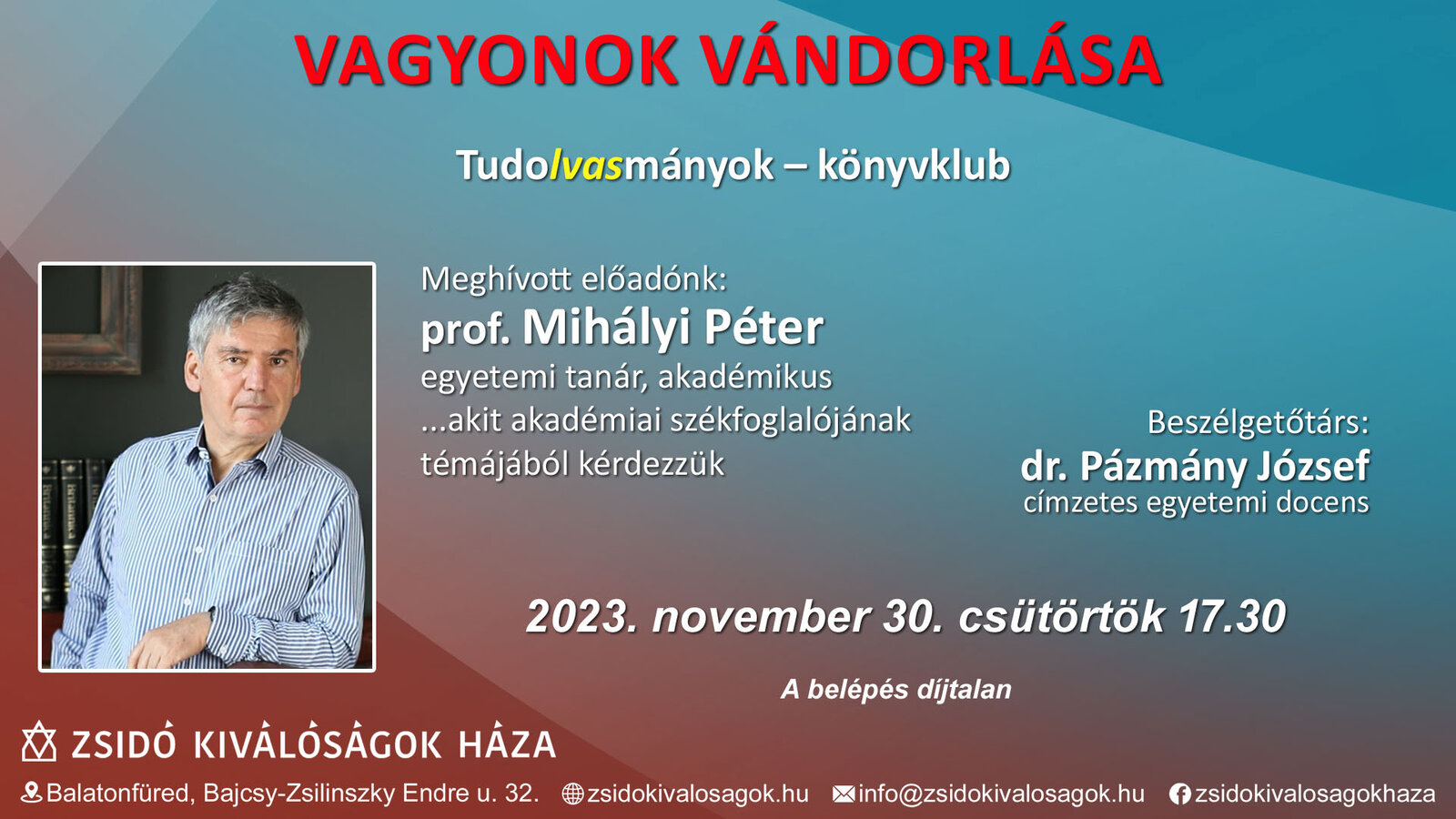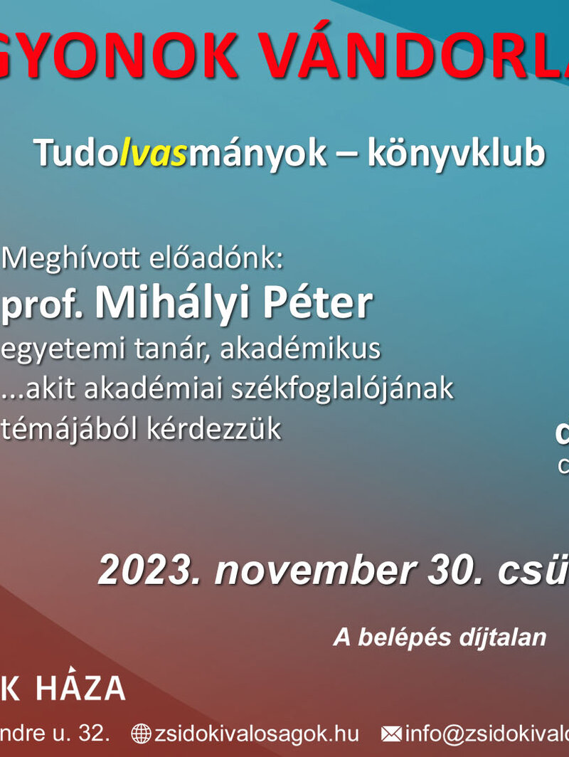 A Tudolvasmányok könyvklub előző előadásában a válság és az infláció került előtérbe. Ez alkalommal prof. Mihályi Péter lesz a Zsidó Kiválóságok Háza vendége, aki a vagyonmozgásokról, azok fejlődéséről és alakulásáról beszél november 30-án, 17:30-kor. A belépés díjtalan!