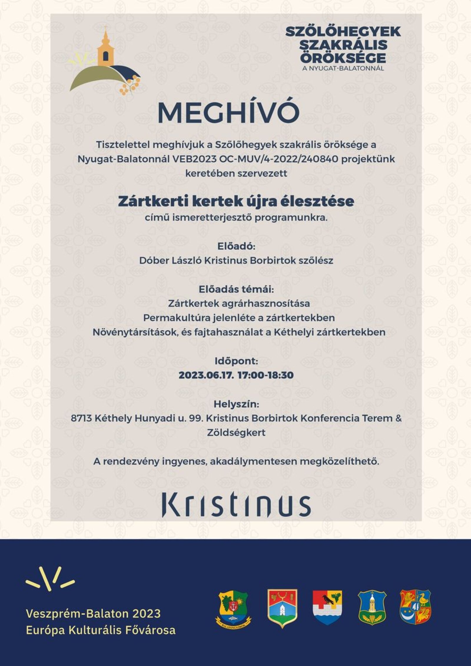 Az eseménysorozat keretében 5 település (Balatongyörök, Lesencefalu, Hollád, Kéthely és Zalaszántó) járja körbe, hogy a szőlőhegyek kapcsolódó kápolnáknak milyen társadalmi, kutlurális, turisztikai öröksége van a XXI. századi ember számára.
