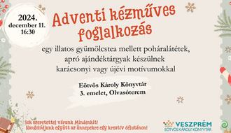 Adventi kézműves foglalkozás Veszprém Közösségi programok Egy kreatív délutánra várják a kicsiket és a nagyokat december 11-én 16:30-kor az Eötvös Károly Könyvárba. Eötvös Károly Megyei Könyvtár 8200 Veszprém, Komakút tér 3 2024. 12. 11. 16:30