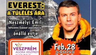 Everest: A túlélés ára - Neszmélyi Emil önálló estje Veszprém Dr. Neszmélyi Emil kétszeres Everest csúcsmászó - aki már hosszú évek óta a Dumaszínház vendégelőadója - különleges és lebilincselő estjével várja az érdeklődőket február 28-án 18:30-kor az Agóra Veszprém Kulturális Központba. Agóra Veszprém Kulturális Központ 8200 Veszprém, Táborállás park 1 2025. 02. 28. 18:30